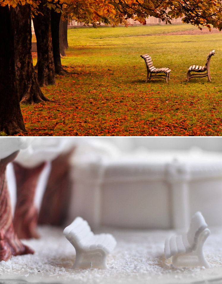 Много интересна задача имах тези дни. Торта за фотограф :) Предполагам, първата мисъл на всеки би била да се пресъздаде любимия му фотоапарат или обектив. Но и поръчителят-сестрата на фотографа- като една творческа личност(моден дизайнер) подходи нестандартно. Предостави ми някои от неговите любими фотографии. Да си избера тази, която ме вдъхнови. Не бързах. Още не можех да визуализирам фотографиите в торти. Тогава ми хрумна мисълта да предизвикам спомен, но не чрез дословно повторение. И есенната картина стана зимна, а тортата просто фон. Доколко успешна е била задачата? Един вълнуващ разказ в снимки е представила Ел в своя блог. Очаквам и снимките от рожденика, защото доколкото разбрах много сериозно се е отнесъл към подаръка си - фонове, стативи, осветление... А аз нетърпеливо бързам да покажа моите влюбени пейки в снега.